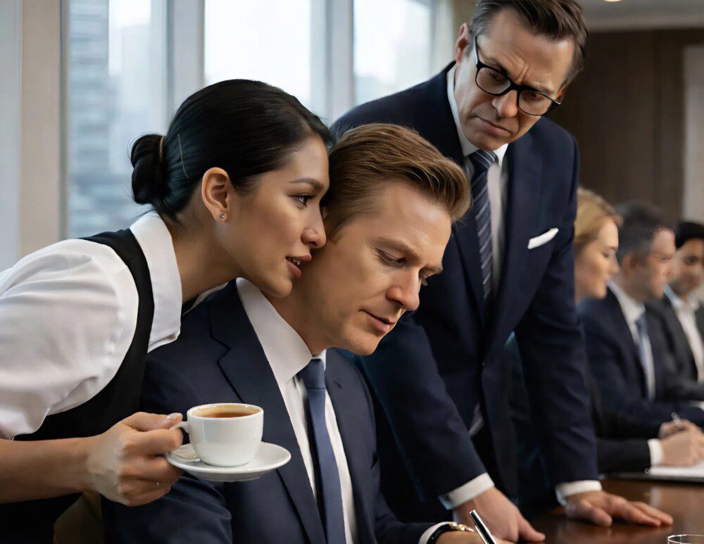 Suddenly, under the pretext of bringing coffee, one of the cleaning staff approached. Leaning toward his ear, with a voice trembling with fear, he whispered something that sent chills down the leader’s spine: